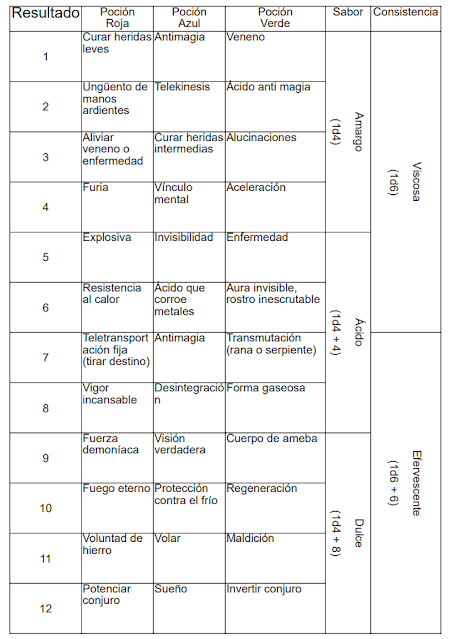 Vamos a llevar más allá lo anterior: un objeto mágico se clasifica en tablas generadoras, según sus propiedades visibles. Una poción puede ser roja, azul o verde, por ejemplo. Una rodela puede brillar en la oscuridad. En este caso, el jugador se anota el color de la poción, y al identificarla o consumirla, se tira en la tabla generadora correspondiente. Demos un vistazo a la tabla, que explicaré en un momento: