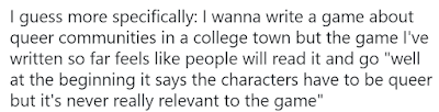 Mi propuesta es que un juego es queer cuando los personajes enfrentan presiones de invisibilización, pérdida de agencia, violencia, asimilación, por parte de estructuras sociales. En un juego queer, posicionarse en relación al poder se vuelve un elemento central, y al cruzar esto con el género y la sexualidad, el posicionamiento se encarna en y tiene consecuencias sobre el propio cuerpo e identidad, en lugar de ser un hecho político panfletario. Descentrarse, construirse en los márgenes, tiene consecuencias reales sobre los individuos, a veces incluso puede costarles la vida, o arrastrarles a situaciones de difícil salida. Fuera del poder, el espacio se lo hace cada une a partir de lo que puede defender, los acuerdos se construyen caso a caso, los aprendizajes surgen de las propias experiencias, ya que la tradición se hace a un lado. Tal nivel de libertad debería sentirse peligroso, hasta cierto punto.