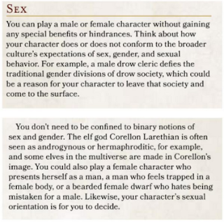 ¿Cómo hacer que un juego sea queer? Varias veces me encontré con juegos que intentan introducir este contenido declarativamente, a partir de una declaración de intenciones, opciones explícitas a la hora de construir un personaje, incluso como reglas. Como ejemplos, tenemos la inclusión de opciones no binarias en Apocalypse World para la creación de personajes, el apartado "Raza, Género y el hecho de ser diferente" en Sombras Urbanas, o el apartado "Sex" en D&D 5ta edición: