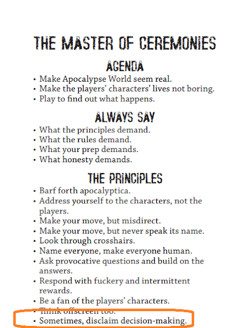 El otro antecedente relevante es el principio de Apocalypse World de delegar la toma de decisiones ("sometimes, disclaim decision making"), si bien ninguno de los mecanismos que ofrece AW para ello involucran el azar directamente (hay una pequeña excepción, véase la adjudicación de probabilidades a la muerte de un personaje no jugador, debido al daño recibido).