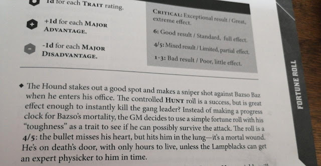 Para los no angloparlantes, el ejemplo plantea la posibilidad de usar una tirada de fortuna para determinar si el disparo de un francotirador es inmediatamente letal, o hay tiempo para que uno de sus contactos lo sane. Aparece, justamente, una tirada de fortuna como un paso adicional entre la intención del jugador y su realización.