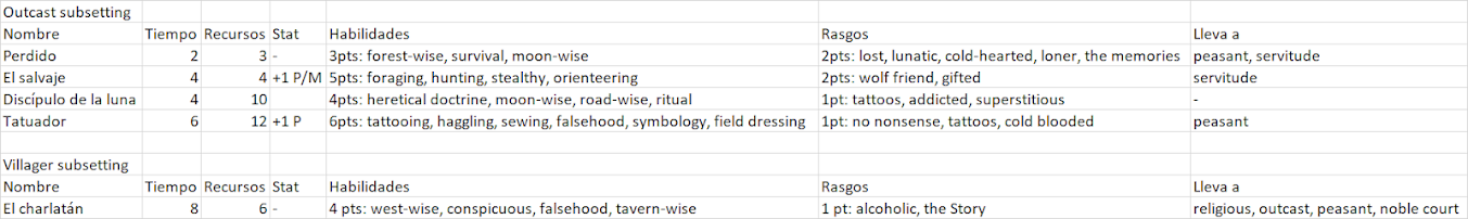 Wolf Friend / Amigo de los lobos (precio: 4pts, die trait): puede usar circles para lobos, aunque tiene +1Ob para humanos fuera de outcast. Tiene circles como si tuviera un lp de Lone Wolf, o bien de Scavenger, de los lobos.