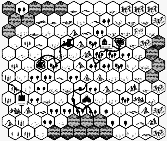 Las instrucciones del manual para poblar el reino son concretas, pero dejan bastante lugar para la creatividad del director, sin dictaminar directamente los tipos de terreno, combinación, o disposición. Sí hay instrucciones claras sobre la cantidad de poblados, los 6 mitos activos, y los puntos de referencia, que los hay de distintos tipos, y que suelen tener efectos sobre los caballeros al pasar por ellos. El mapa de los jugadores, por supuesto, no tiene estos detalles, que sólo conoce el GM (y dado que algunos de mis jugadores leen el blog, no voy a compartirlo).