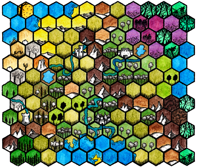 Voy a comentar primero la preparación, ya que fue un gran punto distintivo. El juego va sobre la exploración de un sandbox (caja de arena), a través de un mapa hexagonal del reino que contiene poblaciones, mitos, monumentos, refugios, vestigios del pasado, y toda clase de eventos con los que interactuar o descubrir (aunque los mitos son el eje nodal del juego). Tras ver un video de Chris armando su mapa hexagonal, quise no ser menos, y utilicé un programa llamado Hex Kit para confeccionar el mapa del reino, con resultados modestos primero, y mucho más interesantes después de conseguir mejores diseños de losetas.