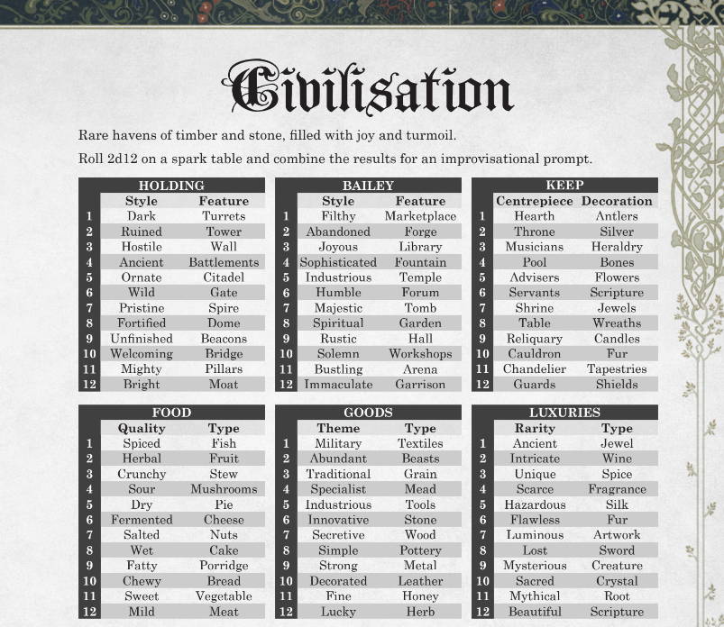 Con el mapa realizado, el siguiente paso fue determinar al azar los 6 mitos, y, por lo menos en mi caso, utilizar unas tablas de disparadores creativos para ayudarme a crear el centro de poder y los 3 asentamientos que ven en el mapa. También, fue un proceso que me tomó muy poco tiempo, y que fue surgiendo casi de la propia geografía junto con las tablas.