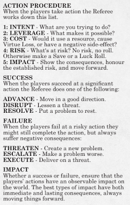 A esto se puede añadir el paso a paso que ayuda a determinar si las intenciones de un jugador se deben transformar o no en una tirada. Chris McDowall, sin tecnicismos ni abstracciones, introduce un paso a paso digno de la resolución de conflictos de los así llamados story games, también con gran poder de síntesis, que ayuda a que el GM pueda decidir, al jugar, si una acción amerita o no tirada.