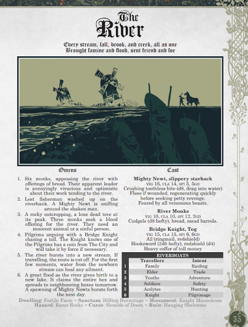 Este primer elemento ya sorprenderá a los conocedores de juegos Powered by the Apocalypse. Si recuerdan Dungeon World, recordarán que los frentes, también, tienen portentos, eventos que van marcando el avance de un frente hacia la realización de su potencial. En Mythic Bastionland pasaría lo mismo, sólo que los mitos son una entidad propia de la ficción, y no sólo una mecánica. Además, los portentos, que ya vienen escritos, son mucho más evocadores, y portadores de una estética extraña que separa a MyBa de cualquier juego de fantasy del montón.