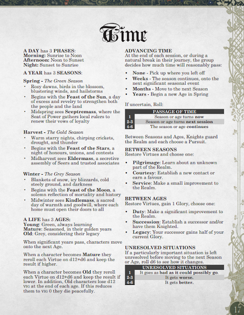 Para empezar, este juego está dentro de mi racha artúrica, ya que también trata sobre caballeros errantes en búsqueda de aventuras (ahora entienden por qué fue amor a primera vista). A diferencia de Pendragón, sin embargo, la fantasía caballeresca adquiere un tono más extraño y abstracto: los caballeros tienen un juramento de honrar a los Videntes, seres castigados, profetas, que los han armado caballeros; deben presenciar mitos, acontecimientos maravillosos y preternaturales; y defender al reino de todo peligro, peligro que en muchas ocasiones vendrá de estos mitos. Es una base distinta a la de Pendragón, que mucho más concreto en los deberes de un caballero, pero el fondo común de ir de aventuras está. Veremos otras diferencias pronto.