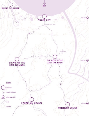 El grupo parte de Ciudad Violeta, finalmente, y toma la ruta del camino alto y camino bajo, que sigue una autopista de coral de tierraseca, parcialmente en ruinas y el último camino en pie del oeste. Van por el camino inferior, no se arriesgan a tomar la autopista, y tienen un accidente desafortunado cuando un caminante de porcelana cae desde la autopista superior, a pocos metros de ellos, y se vuelve loco y empieza a dispararles. Por suerte, consiguen evitar los disparos y su rifle se atasca. Pronto llegan príncipes de porcelana a revisarlo y desactivarlo, y el grupo negocia una retribución de su parte por las molestias.