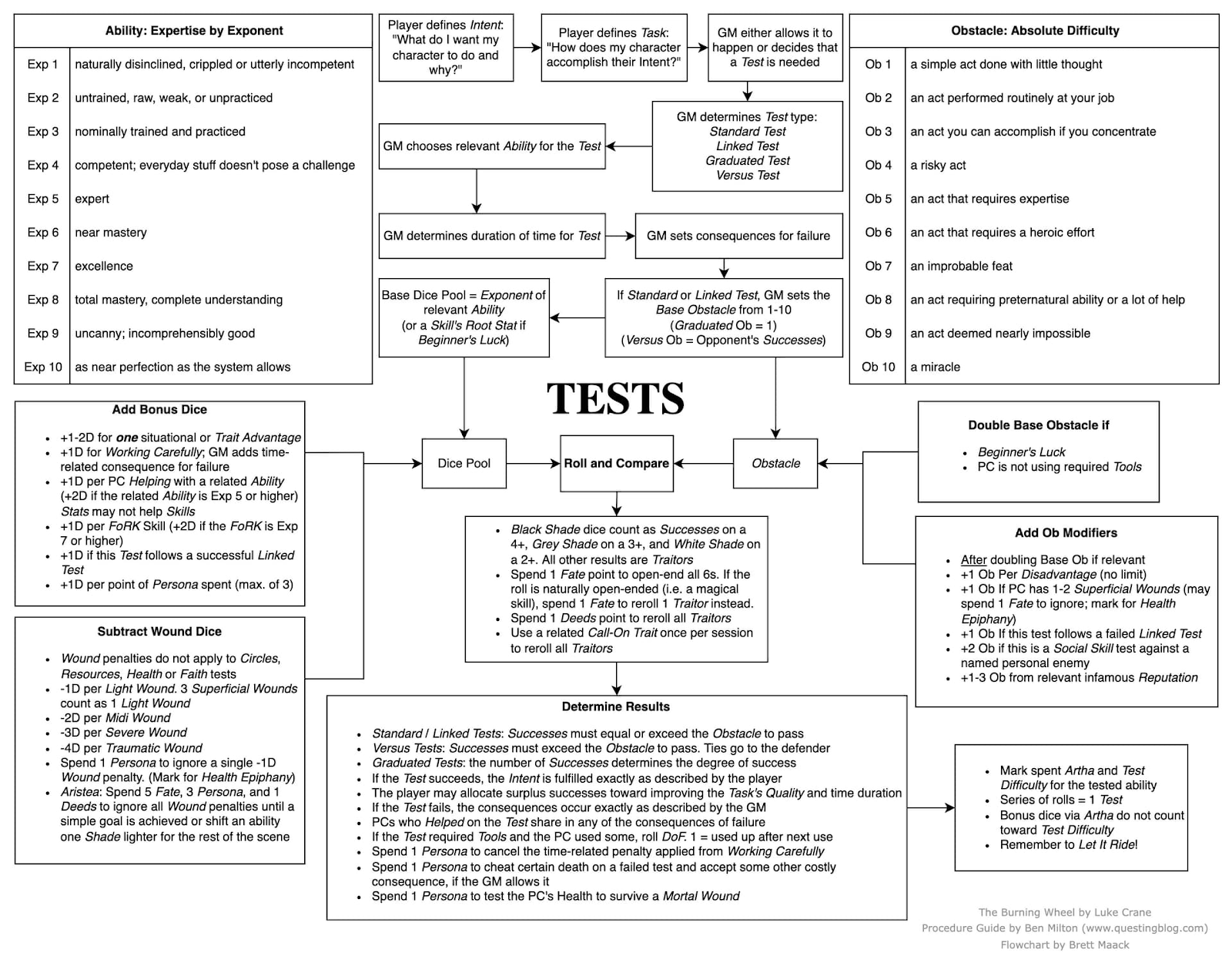 Las tiradas vinculadas, o linked tests, son formas de entrelazar tiradas en Burning Wheel (henceforth BW), de tal modo que una provea de un beneficio o complicación para la siguiente. Una tirada de navegación (evitar una tormenta) que puede ayudar o complicar a la tirada siguiente (de marinero) para mantener el barco en buen estado, que puede ayudar o complicar a la de ship management (que los recursos alcancen para el viaje). Hasta ahí todo bien, y el libro da un ejemplo similar, de hecho.